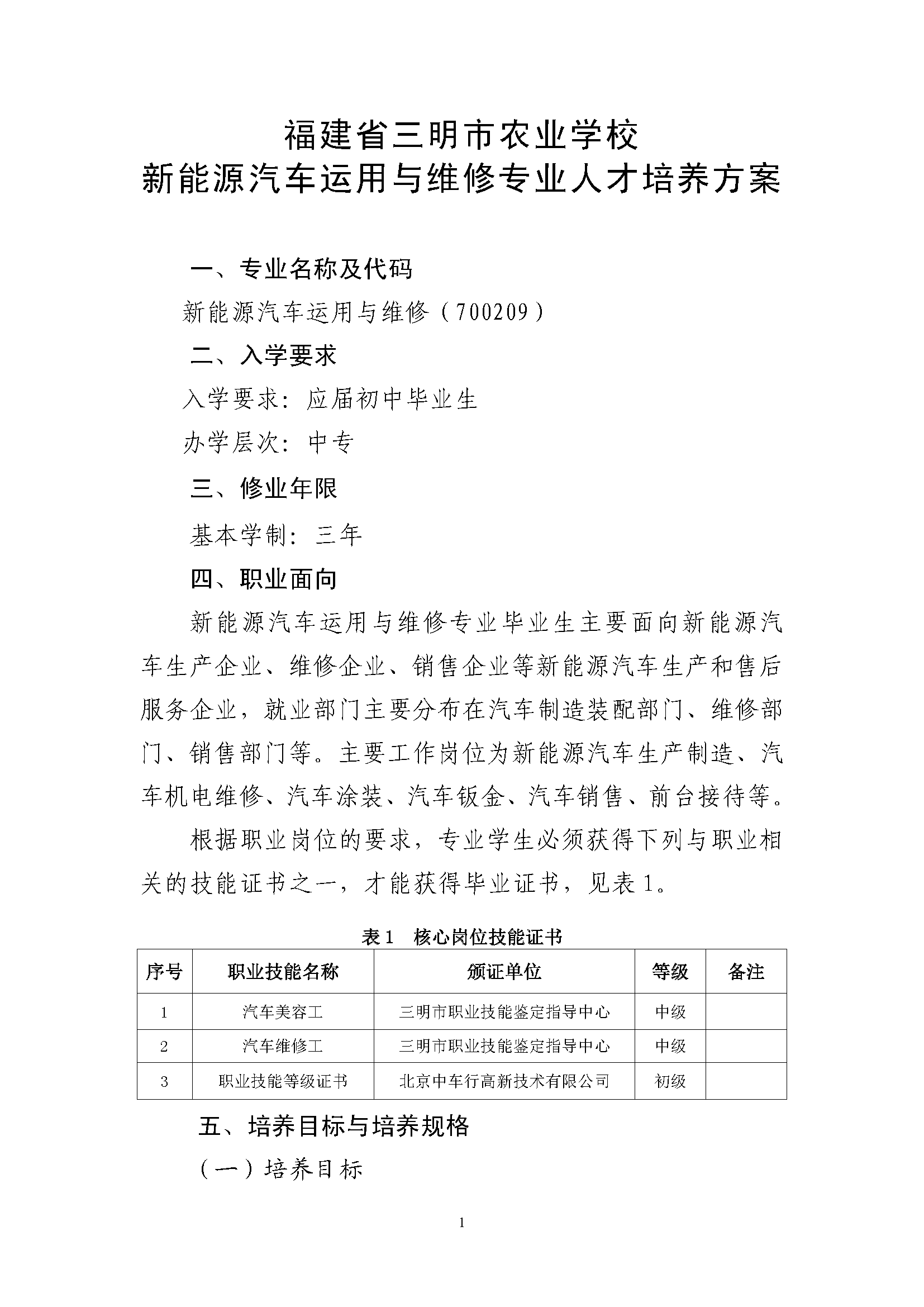 三明市农业学校新能源汽车运用与维修专业人才培养方案(2023)