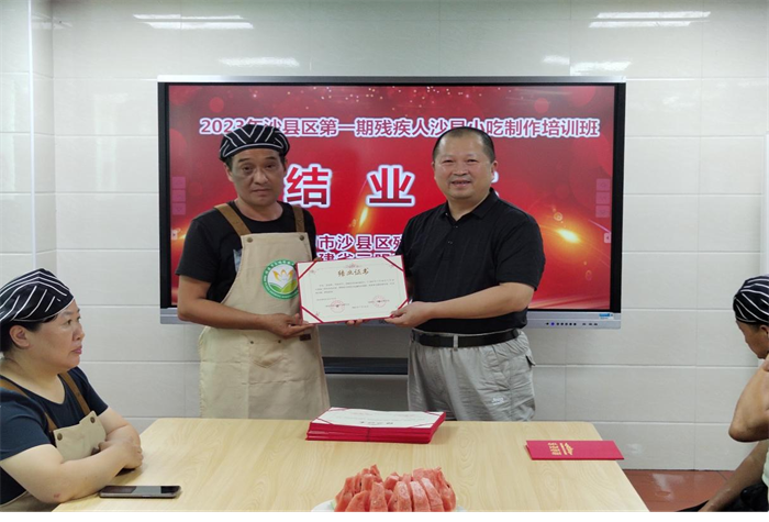 7月14日下午,由三明市沙县区残疾人联合会主办、星空(中国)承办的2023年沙县区第一期残疾人沙县小吃制作培训班结业。沙县区残联副理事长邱文忠出席结业式,并向本班20名学员颁发结业证书。他鼓励学员培训结束后积极投身实践,做到学以致用,实现就业增收。